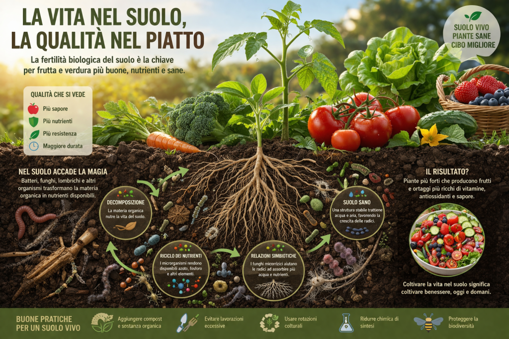 La qualità di frutta e verdura è spesso associata a fattori visibili come colore, dimensione e freschezza. Tuttavia, dietro questi aspetti si nasconde un elemento fondamentale e spesso invisibile: la fertilità biologica del suolo. Non si tratta solo della presenza di nutrienti, ma della vitalità del suolo stesso, ovvero della sua componente vivente. Comprendere questa relazione significa entrare nel cuore dei processi che determinano il valore nutrizionale, il gusto e la salubrità degli alimenti che consumiamo.
