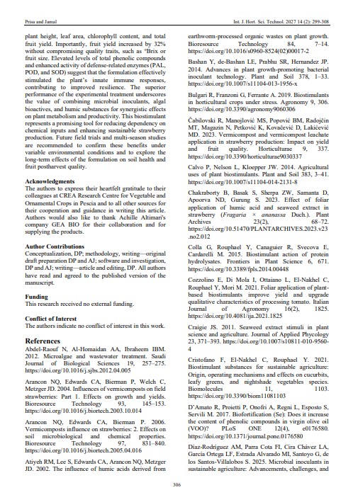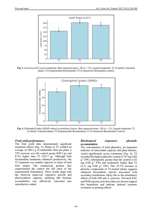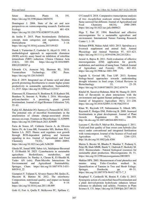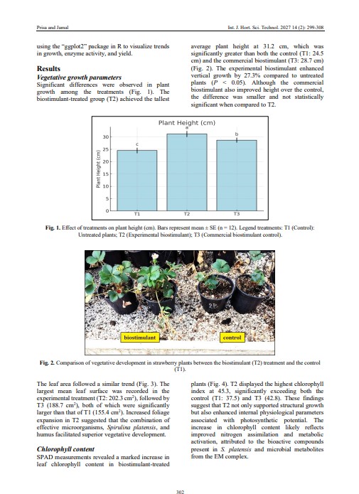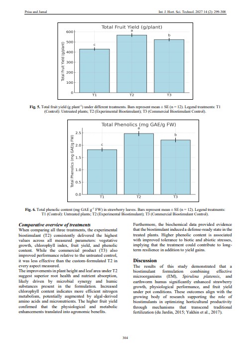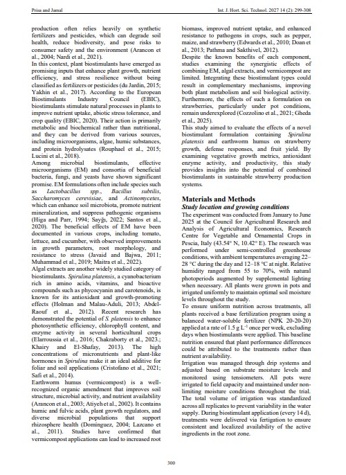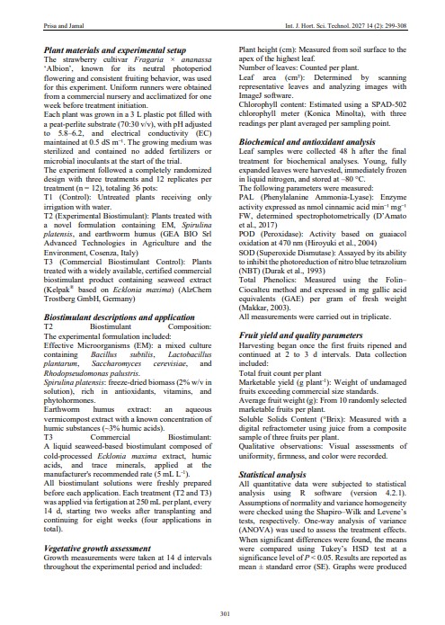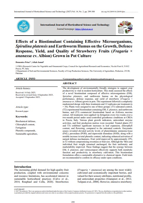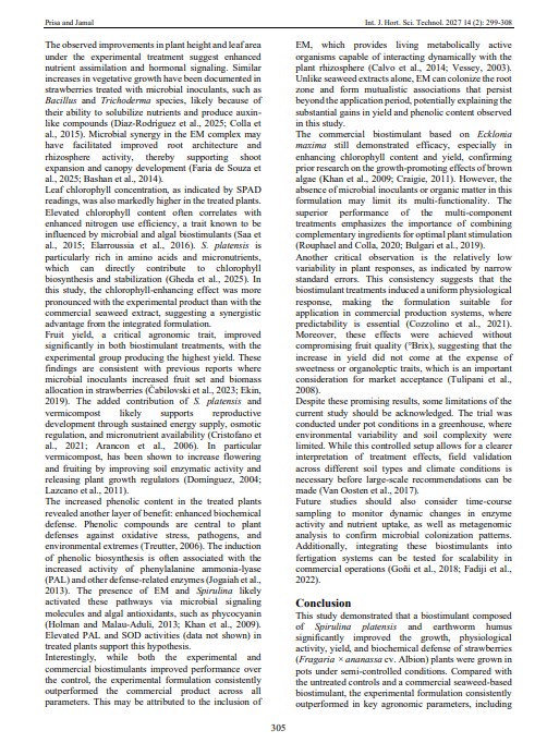The development of environmentally friendly strategies to support crop productivity is increasingly vital in modern horticulture. This study assessed the impact of a novel biostimulant composed of effective microorganisms (EM), Spirulina platensis, and earthworm humus on the physiological performance, defense response, and yield of strawberry (Fragaria × ananassa cv. Albion) grown in pots. The experiment was carried out under semi-controlled conditions at CREA in Pescia, Italy, with biostimulant applications delivered via fertigation every two weeks for a duration of two months. Various plant growth indicators, antioxidant enzyme activities, and fruit production metrics were recorded. Treated plants exhibited significant increases in leaf expansion, chlorophyll content, and flowering compared to untreated controls. Enzymatic assays revealed elevated activity levels of phenylalanine ammonia-lyase (PAL), peroxidase (POD), and superoxide dismutase (SOD), alongside a notable increase in total phenolic content, indicating enhanced activation of natural defense mechanisms. Fruit yield improved by approximately 25% without compromising sweetness or fruit size. Although °Brix and individual fruit weight remained unchanged, the uniformity and marketability of fruits improved. These findings suggest that the synergy between EM, S. platensis, and vermicompost effectively supports both metabolic function and productivity in strawberry cultivation. The use of this biostimulant formulation may offer a practical and sustainable tool for improving horticultural output while minimizing dependence on chemical inputs. Further trials in field conditions are recommended to validate these results across diverse environments and production systems.