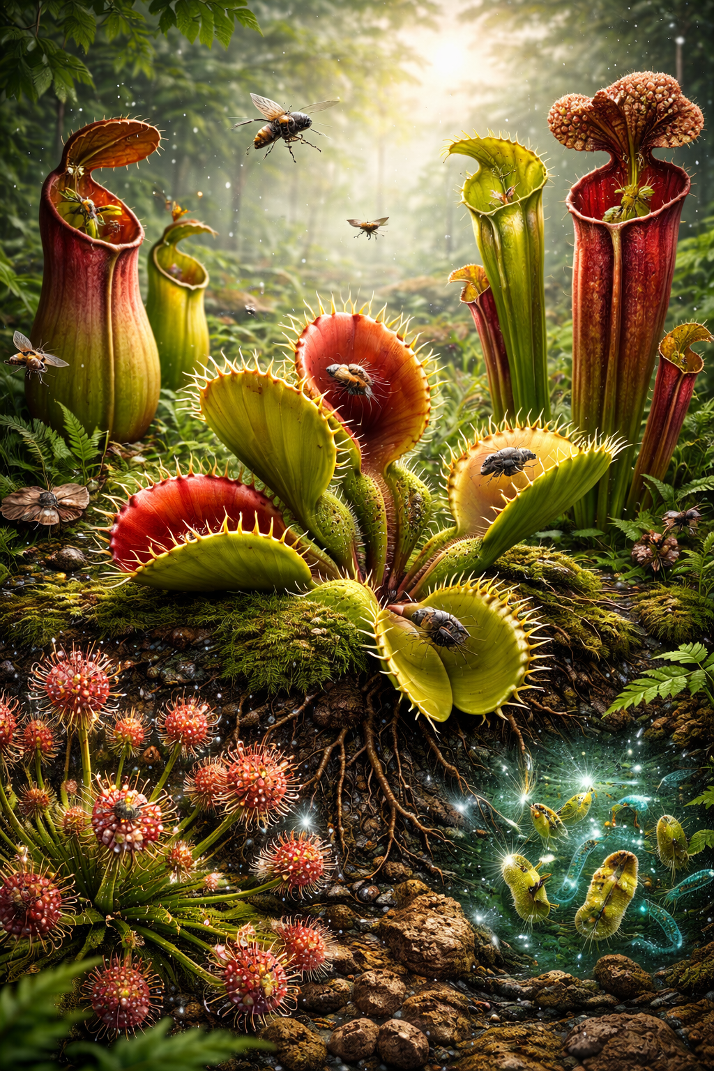 La maggior parte delle piante ottiene i nutrienti essenziali in particolare azoto e fosforo dal suolo. Tuttavia, alcune crescono in ambienti estremamente poveri, come torbiere, paludi acide o suoli sabbiosi e dilavati, dove questi elementi sono scarsi o poco disponibili. In queste condizioni, alcune specie hanno sviluppato una strategia alternativa: catturare piccoli organismi e digerirli per ottenere i nutrienti mancanti. La fotosintesi resta comunque il processo principale per produrre energia, ma la “carnivoria” diventa un’integrazione fondamentale.