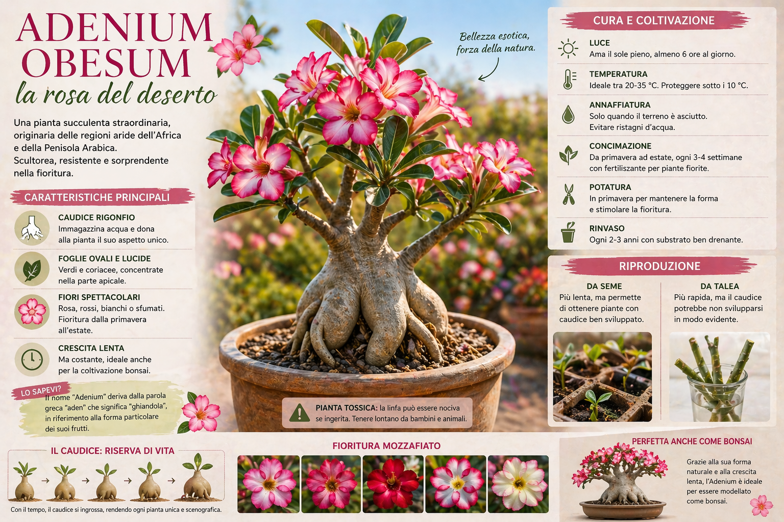 È importante sapere che l’Adenium obesum è una pianta tossica. Contiene sostanze che possono essere pericolose se ingerite, soprattutto per animali domestici e bambini.