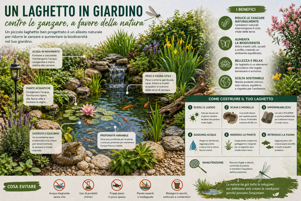 Le zanzare sono tra gli ospiti meno graditi nei nostri spazi verdi. Oltre al fastidio delle punture, possono rappresentare un rischio sanitario, soprattutto nei mesi più caldi. Spesso si pensa che l’acqua in giardino favorisca la loro proliferazione, ma la realtà è più complessa: un piccolo laghetto ben progettato può diventare un efficace sistema naturale per controllare le zanzare, favorendo al tempo stesso la biodiversità. Costruire un laghetto non significa solo aggiungere un elemento decorativo, ma creare un vero e proprio microecosistema in equilibrio, dove predatori naturali contribuiscono a limitare la presenza di insetti indesiderati.