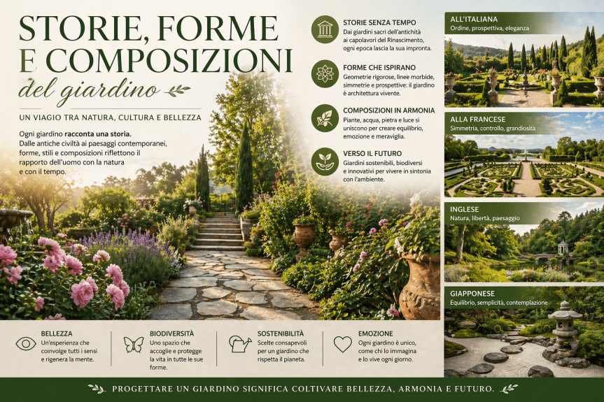 Le storie, le forme e le composizioni del giardino raccontano un viaggio affascinante attraverso il tempo e le culture. Ogni stile, ogni scelta progettuale riflette un modo diverso di interpretare la natura e il ruolo dell’uomo al suo interno. Oggi, più che mai, il giardino rappresenta uno spazio di connessione, benessere e sostenibilità. Che si tratti di un piccolo balcone o di un grande parco, progettare un giardino significa dare forma a un’idea di bellezza che evolve insieme a noi.