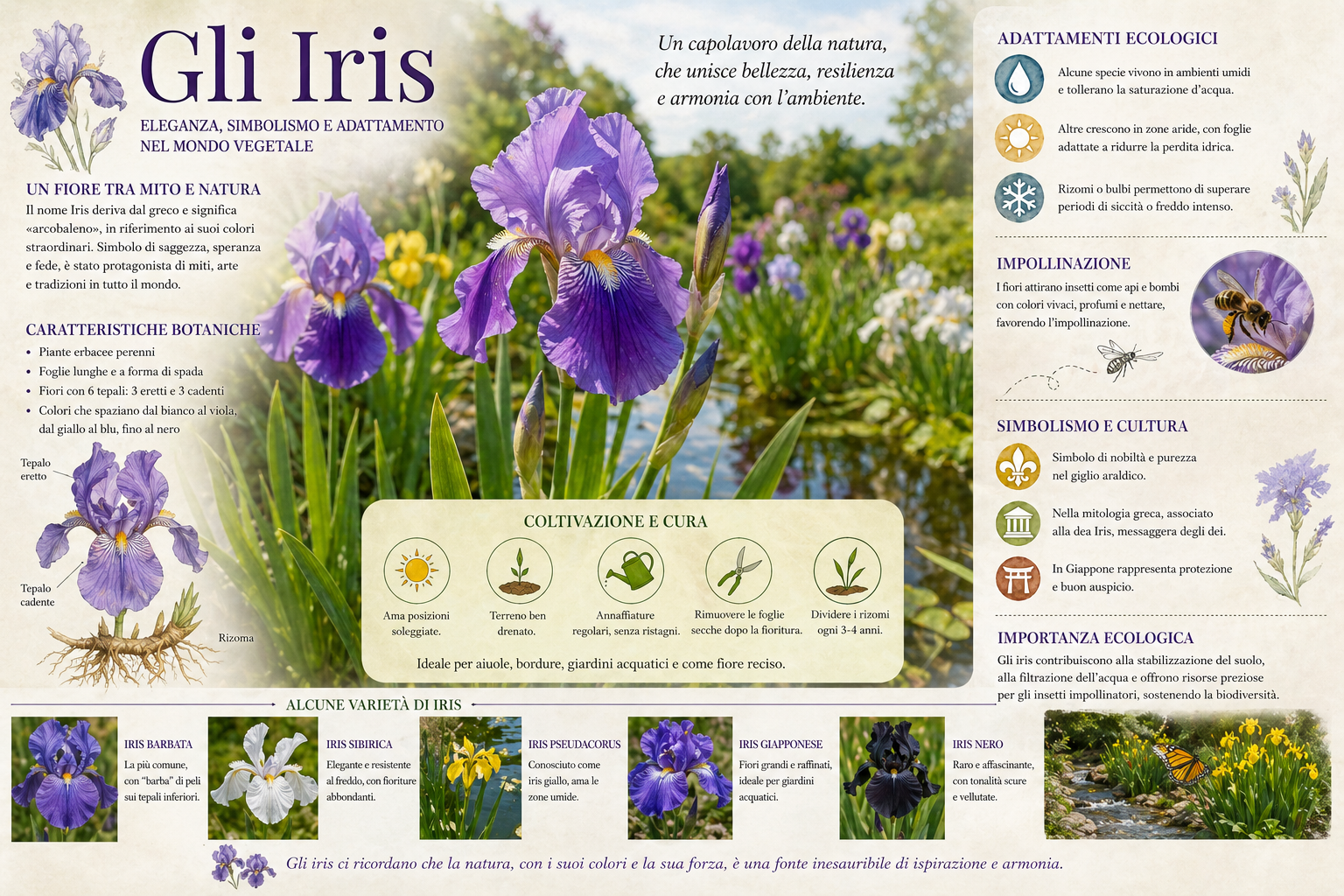 Gli iris rappresentano un perfetto equilibrio tra estetica, adattamento e significato culturale. La loro capacità di prosperare in ambienti diversi, unita alla loro bellezza senza tempo, li rende una delle piante più amate al mondo. Studiare gli iris significa non solo apprezzarne l’aspetto ornamentale, ma anche comprendere i complessi meccanismi ecologici e evolutivi che ne hanno determinato il successo. In un’epoca in cui la biodiversità è sempre più minacciata, valorizzare e coltivare piante come gli iris può contribuire a mantenere vivo il legame tra uomo e natura.