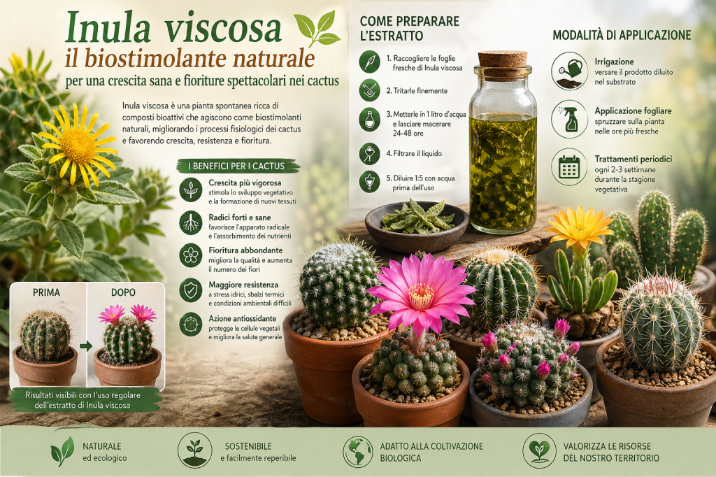 Diversi coltivatori e studi preliminari riportano effetti positivi dell’uso di Inula viscosa sui cactus: